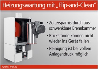 Gerade moderne Brennwertheizkessel, die im Gegensatz zu früheren Anlagen den eingesetzten Brennstoff nahezu hundertprozentig verwerten können, erreichen ihre optimalen Nutzungsgrade nur im technischen Bestzustand. Die Entwicklungsarbeit der Heizungshersteller konzentriert sich deshalb auf eine leichte Erreichbarkeit der wichtigen Anlagenteile für den Servicetechniker. So lässt sich z. B. bei der aktuellen Generation von Gasbrennwertthermen des Systemanbieters Wolf Heiz- und Klimatechnik (Mainburg) die Brennkammer ganz einfach nach außen schwenken. Dort kann sie dann problemlos gereinigt werden, ohne dass eventuelle Rückstände ins Gerät fallen (www.wolf.eu). Diese Funktion, die im Prinzip nicht aufwändiger ist als das Ausschwenken des Filterhalters einer Kaffeemaschine, wird als „Flip-and-Clean“ bezeichnet. Sie sorgt für verkürzte Wartungszeiten, weil weder die Geräteverkleidung noch andere Komponenten demontiert werden müssen. Darüber hinaus ist ein zeitraubendes Ablassen und Wiederauffüllen des Heizwassers nicht nötig: Die Reinigung der ausgeschwenkten Brennkammer kann bei vollem Anlagendruck erfolgen.