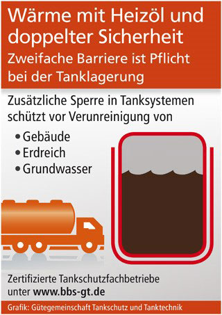 sup.- Die Wärmeenergie Heizöl lagert meistens in einem Kellertank oder in einem Erdtank außerhalb des Hauses. Diese Art der Bevorratung lässt viel Flexibilität beim Brennstoff-Einkauf, verpflichtet die Nutzer aber auch zu einigen Vorsichtsmaßnahmen. Denn jede noch so kleine Undichtigkeit in der Tankhülle kann zum Austritt von Öl und damit zu Verunreinigungen führen. Gelangt das Öl ins Erdreich oder ins Grundwasser, dann wird aus einem unbemerkten Leck leicht ein erheblicher Umweltschaden. Für alle Varianten der Heizöllagerung gilt deshalb grundsätzlich das Prinzip der doppelten Sicherheit: Sollte es zum Austritt von Öl kommen, müssen Gebäude und Umwelt stets durch eine weitere Barriere geschützt sein. Diese zusätzliche Sperre kann bauseitig eine undurchlässig beschichtete Auffangwanne sein, in der der Tank steht. Die inzwischen häufiger genutzte Option sind moderne Tanksysteme, die die gesetzlich vorgeschriebene doppelte Absicherung bereits mit ihrer Installation selbst mitbringen – entweder durch eine doppelte Wandung oder durch eine direkt im Tank integrierte Auffangwanne.