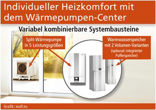 Bauherren oder Modernisierer, die sich für die Installation einer Wärmepumpe entschieden haben, sollten deshalb beim Beratungsgespräch mit einem Heizungsfachbetrieb auf eine systemorientierte Gerätebaureihe mit möglichst variablen Leistungs- und Ausstattungsmerkmalen achten. Der Fachbetrieb hat die Möglichkeit, bei einem Systemspezialisten wie z. B. dem Hersteller Wolf Heiz- und Klimatechnik (Mainburg) aus den 25 Varianten eines so genannten Wärmepumpen-Centers die individuell passende Kombination geeigneter Hightech-Komponenten auszuwählen (www.wolf.eu). Im Zentrum jedes Komplettpakets steht dann eine Split-Luft/Wasser-Wärmepumpe, die das begehrte Gütesiegel des Innovationspreises Plus X Award gleich in vier Kategorien erhalten hat: High-Quality, Design, Funktionalität und Ökologie.