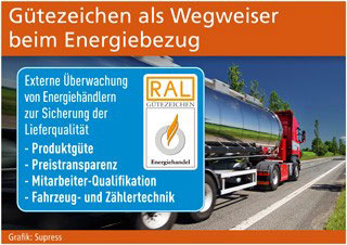 In Deutschland gibt es deshalb seit einigen Jahren ein Qualitätsprädikat, das den Kunden bei der Auswahl seines Energie-Anbieters zuverlässig unterstützt: Das RAL-Gütezeichen Energiehandel kennzeichnet Lieferanten, die sich zu einer kontinuierlichen Überwachung nach den strengen Prüfbestimmungen des Deutschen Instituts für Gütesicherung und Kennzeichnung e. V. verpflichtet haben. Erst wenn externe Sachverständige die Erfüllung aller Anforderungen an Produktqualität, Preistransparenz, die Eichgenauigkeit der Messgeräte und die fachliche Qualifikation der Mitarbeiter bescheinigen, wird das RAL-Gütezeichen verliehen. Ein Verzeichnis unter www.guetezeichen-energiehandel.de listet alle Brennstoffhändler auf, die diese Kontrolle bestanden haben. Wer eines dieser Unternehmen mit der Tankbefüllung beauftragt, wählt einen zuverlässigen Qualitätslieferanten für seinen Energiebezug.