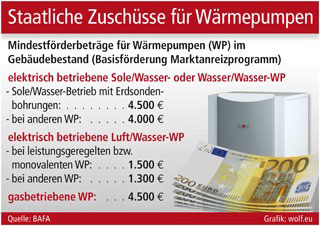sup.- Ob in Privathäusern, Unternehmen oder kommunalen Einrichtungen: Die meiste Energie wird in Deutschland für die Wärmeerzeugung benötigt. Deshalb fördert der Staat gebäudetechnische Konzepte, bei denen erneuerbare Energieträger einen möglichst großen Teil dieser Aufgabe übernehmen. Zu den besonders klimaschonenden und deshalb förderfähigen Heizungslösungen gehört der Umstieg auf eine moderne Wärmepumpe, die die verfügbare Umgebungswärme in Luft, Erdreich oder Grundwasser nutzt. Weil dadurch die erforderliche elektrische Antriebsenergie auf ein Minimum reduziert wird, vergrößert jede Wärmepumpe die regenerativen Anteile im deutschen Energie-Mix. Zuständig für die Vergabe von Zuschüssen ist das Bundesamt für Wirtschaft und Ausfuhrkontrolle (www.bafa.de) im Rahmen des so genannten „Marktanreizprogramms“ (MAP) zur Förderung erneuerbarer Energien. Nach den Richtlinien des MAP können Zuschüsse für die verschiedenen Gerätetypen jeweils erst ab einer Mindest-Jahresarbeitszahl bewilligt werden. Diese Vorgabe wird von Hocheffizienz-Wärmepumpen wie z. B. den Geräten des Systemanbieters Wolf Heiz- und Klimatechnik (Mainburg) unabhängig von der Wärmequelle erfüllt (www.wolf.eu).