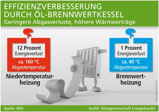sup.- Die Beheizung von Wohngebäuden soll für angenehme Wärme in den Räumen sorgen. Und die dafür erforderliche Energie soll so effizient wie möglich eingesetzt werden. Diesen Leitlinien der häuslichen Wärmeerzeugung dürfte wohl kein Heizungsbesitzer widersprechen. Was dagegen nirgendwo zu den Zielen des Heizens gehört, ist eine Erwärmung der Luft außerhalb des Hauses. Aber genau dies geschieht vor allem in älteren und unsanierten Gebäuden noch immer im großen Stil. Nicht nur wegen der unzureichenden Wärmedämmung von Fenstern und Fassaden, sondern auch wegen der veralteten Heiztechnik. Dort, wo z. B. noch Ölheizkessel mit der so genannten Niedertemperaturtechnik ihren Dienst verrichten, kommen die Abgastemperaturen trotz des irreführenden Namens auf Werte von ca. 160 °C. Es liegt auf der Hand, dass jede Menge wertvoller Energie verloren geht, wenn diese Wärmemengen einfach durch den Schornstein gepustet werden. Nach Angaben des Instituts für Wärme und Oeltechnik (IWO) ist ein Energieverlust von rund zwölf Prozent die kostspielige Folge.