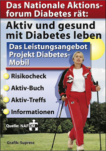 sup.- Wurde bei Ihnen die Diagnose Diabetes (Typ 2) gestellt? Und wollen Sie aktiv und gesund mit Diabetes leben? Dann sollten Sie sich für das Projekt Diabetes-Mobil interessieren. Es wird bereits an 31 Orten in Deutschland angeboten und soll mittelfristig flächendeckend eingeführt werden. Ziel dieser gemeinnützigen Initiative ist es, Patienten durch umfassende Betreuung Hilfestellung dabei zu geben, ihren Lebensstil dauerhaft zu ändern und damit auch ihre Lebensqualität zu verbessern. Diabetes-Mobil ist mit dem Gütesiegel des Nationalen Aktionsforums Diabetes (NAFDM) ausgezeichnet worden. NAFDM wiederum wird vom Bundesministerium für Gesundheit und der Aventis Foundation unterstützt.