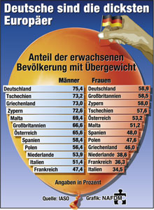 sup.- In Deutschland gibt es mehr Menschen mit Übergewicht als in jedem anderen Land Europas. Zu diesem Ergebnis kommt eine Studie der International Association for the Study of Obesity (IASO). 75,4 Prozent der erwachsenen Männer und 58,9 Prozent der Frauen sind zu dick, haben also einen Body-Mass-Index (BMI) größer als 25. Der BMI ergibt sich aus dem Körpergewicht in Kilogramm geteilt durch die Größe in Meter zum Quadrat. Beispiel: 80 kg : (1,80 m x 1,80 m) = 27.