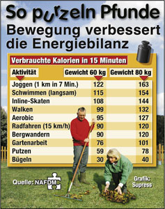sup.- Eine halbe Stunde Walking, eine halbe Stunde Blätter im Garten zusammenfegen und dann noch eine halbe Stunde bügeln: Wer um die 80 Kilo wiegt, hat durch diese körperlichen Aktivitäten bereits 546 Kalorien verbraucht. „Auch wenn es immer wieder gepredigt wird, die meisten Übergewichtigen verdrängen, dass es insbesondere Bewegungsmangel ist, der verantwortlich für ihr Gewichtsproblem ist“, sagt Dr. Peter Schwarz vom Nationalen Aktionsforum Diabetes (NAFDM). Zu den Aufgaben des NAFDM, das vom Bundesministerium für Gesundheit und der Aventis Foundation gefördert wird, gehört es, den Bundesbürgern Spaß an Bewegung zu vermitteln. „Tägliche moderate körperliche Aktivität ist die beste Basis für Gesundheit und der beste Schutz vor Volkskrankheiten wie Bluthochdruck, Störung des Fettstoffwechsels und Diabetes“, so Dr. Schwarz.