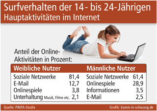 sup.- Das Internet hat vor allem für junge Menschen einen hohen Stellenwert. Insbesondere das Chatten über soziale Netzwerke wird intensiv genutzt. Laut der vom Gesundheitsministerium in Auftrag gegebenen PINTA-Studie (Prävalenz der Internetabhängigkeit) gelten 2,4 Prozent der 14- bis 24-Jährigen bereits als internetsüchtig. In der Altersgruppe zwischen 14 und 16 Jahren sind es sogar vier Prozent. Bei den Hauptaktivitäten der Online-Süchtigen, die dem generellen Surfverhalten von jungen Menschen entsprechen dürften, zeigen sich deutliche geschlechtsspezifische Unterschiede. Während sich junge Frauen offenbar nur wenig für Online-Spiele begeistern, stehen sie bei den männlichen Nutzern mit knapp 30 Prozent an zweiter Stelle.