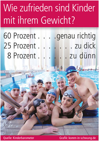 Insbesondere ausreichende Bewegung ist neben ausgewogener Ernährung die wichtigste Voraussetzung für die gesunde Entwicklung von Kindern und Jugendlichen. Laut dem Kinderbarometer treiben fast drei Viertel der 9- bis 14-Jährigen mehrmals die Woche Sport, weitere 14 Prozent mindestens einmal die Woche. Insgesamt, das zeigen zahlreiche Studien, ist die körperliche Aktivität der heutigen Jugend im Vergleich zu früheren Generationen jedoch rückläufig. Viele Stunden in der Freizeit werden vor Bildschirmen verbracht, sei dies die Spielkonsole, der Computer oder der Fernseher. Hier müssen die Eltern gegensteuern. Für eine ausgeglichene Energiebilanz und damit Normalgewicht sind regelmäßige Bewegung und Sport das A und O. Wie der Nachwuchs zu einem bewegungsaktiven Lebensstil motiviert werden kann, darüber informiert z. B. das Ratgeber-Portal www.komm-in-schwung.de.