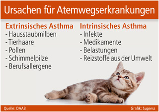 sup.- Die genaue Ursache für die Entstehung von Asthma ist noch unbekannt. Es fällt aber auf, dass Asthma in manchen Familien häufiger auftritt als in anderen. Experten vermuten, dass nicht die Erkrankung selbst weiter vererbt wird, sondern vielmehr die Veranlagung, Asthma im Laufe des Lebens zu entwickeln. Je nach Auslöser wird laut Informationen des Deutschen Allergie- und Asthmabundes (DAAB) zwischen extrinsischem oder allergischem Asthma und intrinsischem bzw. nicht-allergischem Asthma unterschieden. Es sind aber auch Mischformen möglich. Bei Asthma besteht eine Überempfindlichkeit gegenüber so unterschiedlichen Reizen wie einerseits Hausstaubmilben, Tierhaare, Pollen oder Berufsallergene (z. B. Bäckerasthma), andererseits gegenüber Infekten, speziellen Medikamenten, körperlichen bzw. seelischen Belastungen oder Reizstoffen aus der Umwelt wie Luftschadstoffe (vor allem Zigarettenrauch), kalte Luft oder Nebel.