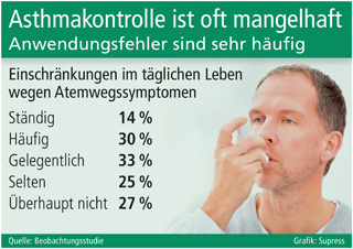sup.- Eine vollständige Asthmakontrolle wird einer Beobachtungsstudie von Lungenfachärzten (Pneumologen) zufolge nur bei 27 Prozent der Patienten erreicht. 25 Prozent der Patienten haben nur selten Einschränkungen im täglichen Leben wegen Atemwegssymptomen und 33 Prozent gelegentliche Beschwerden. Aber bei 30 Prozent der von Asthma geplagten Menschen ist dies häufig der Fall, bei 14 Prozent sogar ständig. Eine äußerst schlechte Bilanz, denn Ziel der modernen Asthmatherapie ist eine komplette Asthmakontrolle. Der häufigste Grund für mangelhafte Asthmakontrolle sind gravierende Fehler bei der Handhabung der Inhalationssysteme. Das zeigt die Auswertung von 2.288 Protokollen zur Inhalationstechnik. Wenn die Wirkstoffe nicht regelmäßig und korrekt inhaliert werden, ist eine effektive Behandlung von Asthma nicht erreichbar.