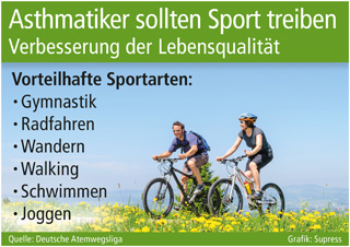 sup.- Entgegen früheren Empfehlungen sind sich heute Ärzte einig: Asthmatiker dürfen nicht nur Sport treiben, sondern sie sollten es sogar unbedingt tun. Studien zeigen, dass selbst bei Patienten mit schwerem Asthma, die eine Dauermedikation benötigen, durch regelmäßigen Sport die Anzahl der symptomfreien Tage deutlich erhöht sowie depressiven Verstimmungen entgegengewirkt werden kann. Laut der Deutschen Atemwegsliga sind insbesondere Ausdauersportarten wie Gymnastik, Radfahren, Wandern, Walking, Schwimmen und Joggen empfehlenswert. Vor dem Training sollten allerdings in jedem Fall Aufwärmübungen gemacht werden.