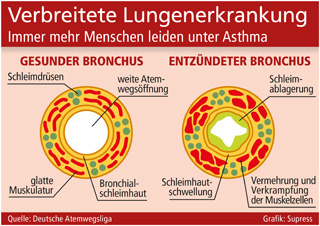 sup.- Allergische Erkrankungen der Atemwege haben in den letzten Jahren deutlich zugenommen. Insbesondere die Anzahl der Menschen, die an Asthma bronchiale leiden, steigt kontinuierlich. Schätzungen zufolge sind bereits über fünf Prozent der Erwachsenen und rund zehn Prozent der Kinder betroffen. Bei Asthma tritt eine wiederholte und plötzliche Verengung der Atemwege auf. Dabei ziehen sich die Muskeln der Bronchien zusammen. Verursacht wird die Verengung durch eine Entzündung der Schleimhaut in den Bronchien. Die Verkrampfung der Bronchialmuskulatur führt dazu, dass die „verbrauchte“ Luft nicht aus den Lungen entweichen und aus diesem Grund nicht genug neue Luft eingeatmet werden kann. Die Bronchien transportieren die Atemluft zu den Lungenbläschen, in denen der Gasaustausch von Sauerstoff und Kohlendioxid stattfindet. Die Bronchien sind zu Beginn sehr dick und verzweigen sich immer weiter. Man kann sie sich gut als einen auf dem Kopf stehenden Baum vorstellen. Die Lungenbläschen bilden dann sozusagen die Blätter.