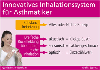 sup.- Untersuchungen zeigen, dass trotz entsprechender Schulung viele Asthma-Patienten die jeweiligen Inhalationssysteme nicht richtig anwenden. Dadurch wird eine optimale Wirkung der verordneten Substanzen verhindert und dementsprechend keine gute Asthmakontrolle erreicht. Diese für den Arzt wie Patienten unbefriedigende Situation soll jetzt durch ein innovatives Inhalationssystem verbessert werden. Die Dosisfreisetzung erfolgt bei dem Trockenpulver-Inhalator Foster Nexthaler (Chiesi) atemzuggesteuert nach dem Alles-oder-nichts-Prinzip: erst ab einem Inspirationsfluss von ca. 40 L/min gibt der Dosisschutz die komplette Dosis frei. „Mit dem Ablauf ‚öffnen, inhalieren, schließen‘ ist der Foster Nexthaler deutlich einfacher anzuwenden als vergleichbare Systeme“, bestätigt der Lungenfacharzt Dr. Rainer Gebhardt (Berlin).