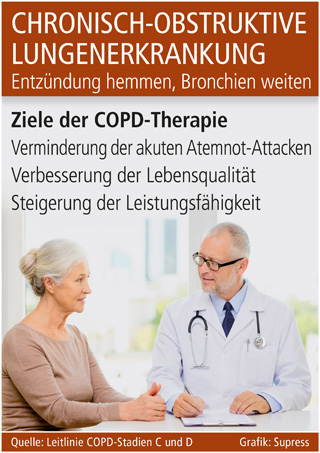 sup.- Die chronisch-obstruktive Lungenerkrankung (COPD) wird meistens erst in einem fortgeschrittenen Stadium diagnostiziert. Der Grund: Viele Betroffene, oft Raucher, scheuen den Weg zum Arzt und arrangieren sich über lange Zeit mit den typischen Symptomen einer COPD wie Husten, Auswurf und Atemnot. Eine Behandlung erfolgt deshalb häufig erst in späteren Krankheitsstadien. Die Patienten können dann schon eine moderate bis schwere Einschränkung der Lungenfunktion und/oder eine Neigung zu akuten Krankheitsverschlechterungen (Exazerbationen) aufweisen. Der aktuellen internationalen Therapieempfehlung, der „Global Initiative for Chronic Obstructive Lung Disease“ (GOLD, 2014) zufolge sollte bei diesen Patienten (GOLD Patientengruppen C und D) eine Therapie mit Fixkombinationen erwogen werden, die entzündungshemmende und bronchienweitende Wirkstoffe enthalten. Verglichen mit der alleinigen Gabe von bronchienweitenden Substanzen kann durch solch eine Fixkombination in vielen Fällen die Rate an Exazerbationen, die oft Krankenhausaufenthalte notwendig machen, deutlich gesenkt werden. „Jede Intervention, die die Entzündung bei COPD vermindert, hilft die Häufigkeit und Schwere von Exazerbationen zu verringern“, erläutert der Lungenfacharzt Dr. Thomas Voshaar (Lungenklinik Bethanien, Moers).