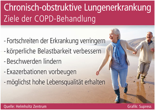 Zwar ist eine ursächliche Heilung der COPD bis heute nicht möglich, dennoch lassen sich bei Früherkennung der Lungenerkrankung ganz wesentliche Therapieziele realisieren. Dazu gehören laut dem Helmholtz Zentrum (München), dass ein Fortschreiten der Erkrankung gebremst, die körperliche Belastbarkeit verbessert und die Beschwerden gelindert werden können. Außerdem kann akuter anfallsartiger Atemnot (Exazerbation), die meist einen Krankenhausaufenthalt notwendig macht, vorgebeugt werden. Insgesamt trägt eine adäquate Behandlung mit Medikamenten entscheidend dazu bei, eine möglichst hohe Lebensqualität zu erhalten. Neue Studien haben gezeigt, dass sich die Entzündungsprozesse bei der COPD ebenso wie bei Asthma-Patienten auf den gesamten Bronchialbaum inklusive seiner Verästelungen erstrecken. Von Vorteil sind deshalb Inhalatoren (z. B. Foster), die entzündungshemmende und bronchienerweiternde Substanzen in extrafeinen Teilchen enthalten. Dank dieser innovativen Formulierung können die Medikamente ihre Wirksamkeit in den großen wie auch den kleinen Atemwegen entfalten.