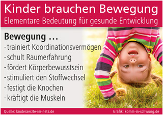 Das eindeutige Urteil von Ärzten lautet deshalb: Kinderwelt muss Bewegungswelt sein – das trifft gerade auch im Zeitalter der digitalen Medien zu. Dieser hohe Stellenwert von körperlicher Aktivität für gesundes Heranwachsen ihrer Sprösslinge ist Eltern oft jedoch nicht bewusst und sie tun zu wenig, um den natürlichen Bewegungsdrang zu fördern. Im Gegenteil, oft wird aus übertriebener Angst vor Verletzungen Klettern, Toben und Rennen sogar unterbunden. Tipps und Anregungen für einen bewegungsfreudigen Lebensstil, der dem jeweiligen Alter der Kinder angemessen ist, gibt z. B. das von Experten konzipierte Ratgeber-Portal www.komm-in-schwung.de.