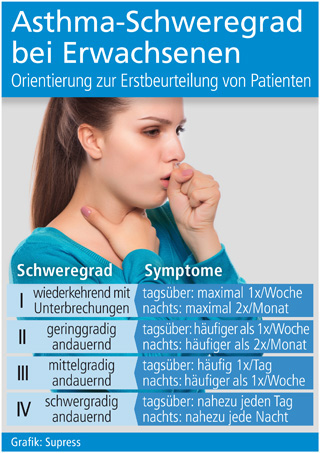 sup.- Schätzungen zufolge leiden in Deutschland mehr als fünf Prozent der Erwachsenen unter Asthma bronchiale – Tendenz steigend. Diese chronisch entzündliche Erkrankung der Bronchien kann auch erst im Senioren-Alter auftreten, z. B. durch einen Etagenwechsel der Auswirkungen von jahrzehntelangem Heuschnupfen von den oberen auf die unteren Atemwege. Neu aufgetretenes und unbehandeltes Asthma kann zur Erstbeurteilung von Patienten in vier Schweregrade unterteilt werden. Dabei spielen die Häufigkeit der Symptome (siehe Grafik) sowie die Lungenfunktion der Betroffenen eine ausschlaggebende Rolle. Mit Ausnahme des Schweregrads I, bei dem eine Bedarfstherapie ausreicht, ist bei allen anderen Ausprägungen von Asthma eine tägliche Dauertherapie empfehlenswert.