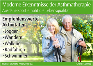 sup.- Asthmatiker können aufatmen: Moderne Erkenntnisse zeigen, dass sie sich nicht schonen und mit einer eingeschränkten körperlichen Leistungsfähigkeit abfinden müssen, sondern dass ihnen im Gegenteil wie allen Menschen sportliche Aktivitäten zugutekommen. Laut Schätzungen des Lungeninformationsdienstes (Helmholtz Zentrum, München) leiden bis zu fünf Prozent aller Erwachsenen in Deutschland unter dieser chronischen Atemwegserkrankung. Aktuelle Studien belegen: Selbst Patienten mit mittelgradigem bis schwerem Asthma profitieren von einem zweimal wöchentlichen Ausdauertraining von je rund 30 Minuten durch eine deutliche Erhöhung der symptomfreien Tage verglichen mit inaktiven Asthmatikern. Besonders gut geeignet sind nach Informationen der Deutschen Atemwegsliga Sportarten wie Joggen, Wandern, Walking, Radfahren oder Schwimmen.