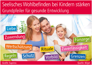 Die BZgA weist darauf hin, dass Kinder mit Hilfe ihrer Eltern vom Tag der Geburt an die für das psychische Gleichgewicht notwendigen Eigenschaften entwickeln müssen. „Psychische Gesundheit versetzt den Menschen in die Lage, mit den alltäglichen Lebensbelastungen umgehen und sie gut bewältigen zu können.“ Ganz wesentlich zur Stärkung des seelischen Wohlbefindens sind für Kinder die bedingungslose Liebe, Zuwendung und Wertschätzung der Eltern oder zumindest eines Elternteils, die Aufmerksamkeit und Zuverlässigkeit, die Fürsorge und der Schutz. Wichtig ist zudem, wie Eltern die Entwicklung der Fähigkeiten ihres Sprösslings unterstützen. So sollte z. B. die Eigenaktivität gefördert werden, indem Raum gelassen wird, Lösungen und Grenzen selbst auszuloten. Dazu braucht das Kind aber Sicherheit, Halt, Orientierung und die Eltern als Vorbild. Sinnvolle Regeln und nachvollziehbare Grenzen helfen, die Welt besser begreifen und meistern zu können. Außerdem brauchen Kinder Regelmäßigkeiten im Alltag, Strukturen und Rituale.