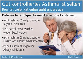 sup.- Dank moderner Medikamente ist Asthma bronchiale heute gut in den Griff zu bekommen. Als erfolgreich gilt eine Behandlung laut den GINA-Leitlinien (Global Initiative for Asthma), wenn der Patient nicht mehr als zweimal pro Woche tagsüber unter Symptomen wie Husten, Atemnot oder Brustenge leidet. Entsprechend sollte auch nicht häufiger als zweimal je Woche der Einsatz von Bedarfsmedikamenten notwendig sein. Zu den Kriterien für gut kontrolliertes Asthma zählen außerdem ungestörte Nachtruhe ohne Beschwerden sowie keine Einschränkungen bei Alltags-Aktivitäten. Soweit die Theorie, die Realität sieht allerdings bei der Mehrheit der Asthmatiker anders aus. Wie die Ärzte Zeitung unter Berufung auf eine aktuelle Umfrage bei knapp 300 Patienten berichtet, gehören für 93 Prozent der Asthmatiker krankheitsbedingte Symptome zum Alltag, durch die sich 64 Prozent bei ihren täglichen Aktivitäten beeinträchtigt fühlen. 66 Prozent der Asthma-Patienten haben zudem regelmäßig Schlafstörungen.