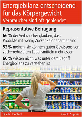 Wurden früher beispielsweise vor allem fett und cholesterinreiche Lebensmittel an den Pranger gestellt, stehen heute insbesondere Zucker und mit Zucker zubereitete Lebensmittel im Fokus der Kritik. Das Ergebnis: Wie die Innofact-Umfrage zeigt, glauben 66 Prozent der Verbraucher, dass Produkte, die weniger Zucker enthalten, kalorienärmer sind. Eine irrige Annahme, denn gerade in festen Lebensmitteln wird Zucker häufig durch andere Zutaten ersetzt, die oftmals sogar mehr Kalorien enthalten. Entsprechend falsch ist auch die Annahme, dass man von zuckerreduzierten Lebensmitteln guten Gewissens mehr essen könne, wie 52 Prozent der Verbraucher meinen.