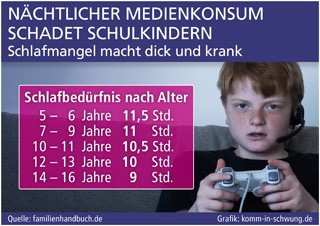 Doch diesen Empfehlungen entsprechen Studien zufolge immer weniger Schulkinder. Insbesondere der seit Jahren zunehmende nächtliche Medienkonsum in Kinderzimmern begünstigt chronischen Schlafmangel. Dieses Defizit hat nicht nur negativen Einfluss auf die Leistungsfähigkeit, sondern auch auf die psychische wie physische Gesundheit. Hinzu kommt: Untersuchungen zeigen, je weniger Kinder sich tagsüber bewegen, desto länger brauchen sie zum Einschlafen.