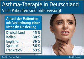 Europäische Vergleichszahlen zeigen, dass eine Hochdosis-Therapie mit entzündungshemmenden Wirkstoffen (Steroiden) bei uns zu selten im Kampf gegen Asthma zum Einsatz kommt. Solch eine täglich zu inhalierende Hochdosis erhalten in Deutschland lediglich 15 Prozent der Asthma-Patienten, in Italien sind es 30 Prozent, in England und in Spanien jeweils 36 Prozent und in Frankreich sogar 53 Prozent. Grund für das sehr zurückhaltende Verordnungsverhalten ist zum Teil auch die ausgeprägte Angst der Deutschen vor Nebenwirkungen bei Steroid-Präparaten, also kortisonhaltigen Medikamenten. Dabei sind die modernen, synthetischen Kortison-Produkte in ihrem Nebenwirkungsprofil nicht annähernd mit den früheren Präparaten aus den siebziger Jahren vergleichbar. Die dennoch bestehenden Ängste sind irrational, weil sie wissenschaftlich nicht begründet sind. Hinzu kommt: Anders als Tabletten oder Spritzen wirken inhalative Steroid-Substanzen nicht auf den kompletten Körper (systemisch), sondern im Wesentlichen lokal begrenzt auf die entzündeten Atemwege. Es ist deshalb eine fatale Entscheidung, wenn Menschen mit Asthma aus Angst vor Kortison auf eine Hochdosis-Therapie verzichten. „Die Behandlung mit hochdosiertem inhalativen Steroid wie bei der Kombination Foster 200/6 erlaubt es uns, bei Patienten, die trotz Dauertherapie immer noch eine unvollständige Asthmakontrolle haben, die anti-entzündliche Therapie zu intensivieren, ohne z. B. systemische Kortikoide einsetzen zu müssen“, erklärt Dr. Ronald Doepner, Facharzt für Pneumologie aus Dortmund. Zur Verbesserung ihrer Lebensqualität sollten Asthmatiker solch eine Verordnung nicht ablehnen, sondern im Gegenteil aus eigenem Interesse ihren behandelnden Arzt ansprechen und diese einfordern.