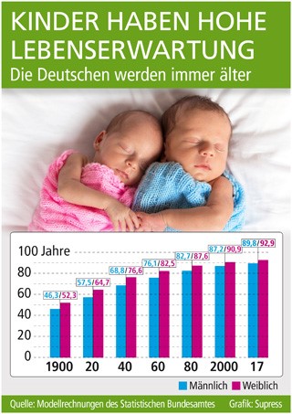 sup.- Ein in diesem Jahr geborenes Mädchen hat in Deutschland eine durchschnittliche Lebenserwartung von 92,9 Jahren, ein Junge kommt auf 89,8 Jahre. Grundlage dieser Schätzungen des Statistischen Bundesamtes (Wiesbaden) sind Modellrechnungen, die auf den so genannten Kohortensterbetafeln der Geburtsjahrgänge von 1871 bis 2017 basieren. Voraussetzung für diese Vorhersagen ist den Statistikern zufolge, dass der Trend zu einem immer längeren Leben anhält.