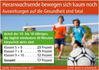 sup.- Eine bewegungsfreudige Freizeitgestaltung kommt bei Kindern und Jugendlichen vor allem aufgrund der hohen Attraktivität von digitalen Medien zunehmend viel zu kurz. Immer weniger Heranwachsende entsprechen der Empfehlung der Weltgesundheitsorganisation (WHO) von mindestens täglich 60 Minuten moderater Bewegung, so dass die Schweißproduktion angeregt, die Atmung schneller und die Herzfrequenz höher wird. Laut dem Präventionsradar 2017 der DAK-Gesundheit, für den knapp 7.000 Schüler der Klassen 5 bis 10 (10- bis 18-Jährige) interviewt wurden, erfüllen nur noch 17 Prozent der Kids dieses WHO-Aktivitätskriterium. Dabei hat sich erneut gezeigt, dass das Bewegungsniveau mit zunehmendem Alter weiter sinkt. Während bei Schülern der Klassen 5 und 6 zumindest 23 Prozent ausreichend körperlich aktiv sind, trifft dies bei Jugendlichen der Klassen 9 und 10 nur noch auf zwölf Prozent zu.