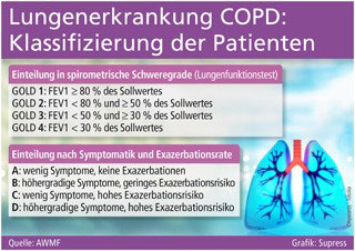 Die Therapie soll nach der deutschen Leitlinie nun vorranging anhand individueller Atemwegssymptome sowie der Häufigkeit der so genannten Exazerbationen in die Patientengruppen A bis D eingeteilt werden. Exazerbationen sind plötzliche gesundheitliche Verschlechterungen, die oftmals durch einen Infekt ausgelöst werden und sich z. B. durch extreme Atemnot-Anfälle und verstärkten Husten mit Auswurf auszeichnen oder sogar einen Krankenhausaufenthalt nach sich ziehen.