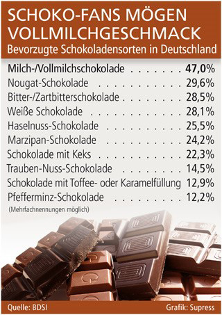 sup.- Milch bzw. Vollmilch ist die mit Abstand beliebteste Geschmacksnote, wenn die Deutschen Schokolade kaufen. Fast die Hälfte der Verbraucher (47 Prozent) bevorzugt die bewährte Sorte. Zu diesem Ergebnis kommt eine repräsentative Umfrage des Bundesverbandes der Deutschen Süßwarenindustrie (BDSI), die auch Mehrfachnennungen zuließ. Die Rangliste sieht Nougat-Schokolade mit 29,6 Prozent auf Platz 2, gefolgt von Bitter-/Zartbitterschokolade mit 28,5 Prozent sowie weißer Schokolade, die 28,1 Prozent der Deutschen mögen. Ebenfalls beliebt bei jeweils rund einem Viertel der Befragten sind die Klassiker Haselnuss- und Marzipan-Schokolade. Noch nicht in der Schoko-Top-Ten sind dagegen die etwas exotischeren Geschmacksvarianten, die beispielsweise Gewürze wie Chili oder Pfeffer bzw. Fruchtfüllungen enthalten. Aber auch diese Sorten haben ihre Fans und belegen, dass Vielfalt und Abwechslung für die Konsumenten trotz der Vollmilch-Dominanz durchaus eine Rolle spielen.