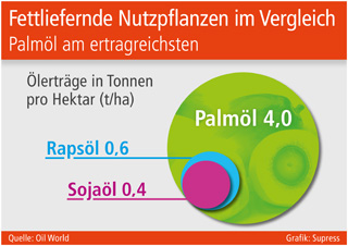 sup.- Fettliefernde Nutzpflanzen bilden einen wesentlichen Eckpfeiler für die weltweite Ernährungssicherheit. Ein besonderer Stellenwert kommt dabei Palmöl zu, einem vielseitigen Rohstoff, der zudem am ertragreichsten im Vergleich zu anderen fettliefernden Nutzpflanzen ist. Laut Angaben von Oil World können pro Hektar Anbaufläche durchschnittlich vier Tonnen Palmöl gewonnen werden. Zum Vergleich: Bei Rapsöl liegt der Ertrag nur bei 0,6 und bei Sojaöl bei 0,4 Tonnen je Hektar. Im Gegensatz zu tierischen Fetten enthalten pflanzliche Fette keine gesundheitsschädigenden Trans-Fettsäuren, sondern eine Kombination aus gesättigten, einfach gesättigten und mehrfach ungesättigten Fettsäuren. Palmöl wird z. B. bei der Produktion von Margarine, Teig- und Backwaren, Schokolade, Suppen, Saucen und Fertiggerichten genutzt, aber auch für die Herstellung von Hygieneartikeln wie Seifen und Kosmetika. Zunehmend umstritten ist der Einsatz von Palmöl als Biokraftstoff.