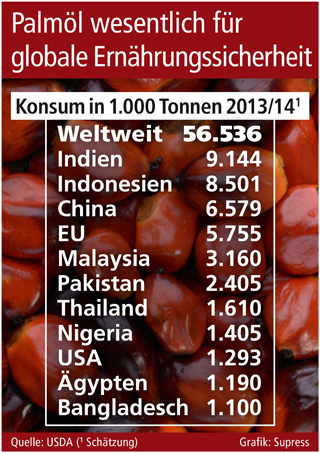 sup.- Beim weltweiten jährlichen Verbrauch von Palmöl steht Indien mit über neun Mio. Tonnen an der Spitze, gefolgt von Indonesien (8,5 Mio. t) und China (6,6 Mio. t). Das pflanzliche Fett gehört in vielen Ländern zu den wichtigsten Grundnahrungsmitteln und spielt angesichts der schnell steigenden Weltbevölkerung eine entscheidende Rolle bei der globalen Ernährungssicherheit. Ölpalmen sind äußerst ertragreich: Obwohl von den weltweiten Anbauflächen für fettliefernde Nutzpflanzen laut Angaben der Organisation Oil World nur 5,3 Prozent zur Gewinnung von Palmöl genutzt werden, liegt der Ertrag an der gesamten Produktion von Pflanzenölen bei 36,4 Prozent. Verwendet wird Palmöl vor allem als Nahrungsmittel (73 Prozent), der industrielle Bedarf liegt bei ca. 27 Prozent.