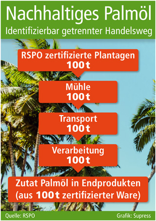 Allerdings besteht auch die Möglichkeit, eine Mischung aus zertifiziertem und nicht zertifiziertem Palmöl unter einer so genannten Massenbilanz zu beziehen. Solche Produkte sind an dem Hinweis „Trägt zur Herstellung von zertifiziertem nachhaltigem Palmöl bei“ und dem RSPO-Warenzeichen mit dem zusätzlichen Etikett „Gemischt“ erkennbar.
