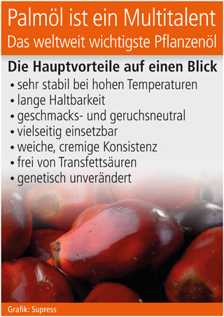 Gleichzeitig punktet Palmöl mit vielen Vorteilen, die es als Bestandteil der Rezeptur für zahlreiche Nahrungsmittel wie Margarine, Süßwaren, Fertiggerichte, Snacks, Schokolade, Speiseeis und Backwaren nahezu unverzichtbar machen. Es ist sehr stabil auch bei hohen Temperaturen und eignet sich deshalb besser zum Kochen und Braten als andere Öle und Fette. Palmöl trägt zudem dazu bei, den Geschmack eines Produktes über dessen gesamte Haltbarkeitsdauer zu bewahren. Aufgrund seiner Geschmacksneutralität überdeckt es nicht das Aroma anderer Zutaten. Palmöl kann in eine flüssige (Öl) und eine feste Art (Fett) aufgespaltet werden. Beide Formen lassen sich mischen und können für die unterschiedlichsten Anforderungen genutzt werden. Cremigkeit und Konsistenz bietet Palmöl im Gegensatz zu anderen Ölen, ohne dass es hierzu gehärtet werden muss. Deshalb ist Palmöl frei von gesundheitsschädlichen Transfettsäuren, außerdem genetisch unverändert.