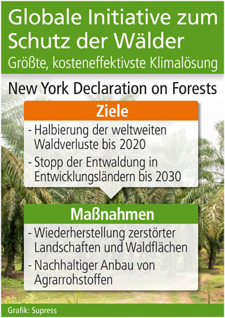 sup.- Bis 2050 wird sich die Zahl der Menschen auf neun Milliarden erhöhen. Die Zunahme der Weltbevölkerung ist mit großen Herausforderungen wie z.B. Ernährungssicherheit und Klimabeständigkeit verknüpft. Jedes Jahr verschwinden rund 13 Mio. Hektar Wald – etwa die Hälfte davon für die Herstellung von Produkten wie Soja, Palmöl, Papier oder Fleisch. Um dieser Entwicklung entschieden entgegenzuwirken wurde auf dem New Yorker Klimagipfel im September 2014 auf Anregung von Deutschland, Großbritannien und Norwegen die international beispiellose und branchenübergreifende Initiative „New York Declaration on Forests“ zum Schutz der Wälder verabschiedet. Diese weist daraufhin, dass der Wald im Allgemeinen die größte und kosteneffizienteste Form des Klimaschutzes sei. Unterstützt wird die Erklärung von über 150 Regierungen, multinationalen Unternehmen (z. B. Danone, Ferrero, Johnson & Johnson, Kellogg’s, Nestlé, Procter & Gamble) sowie einflussreichen Zivilgesellschaften und einheimischen Organisationen. Die Verringerung von Emissionen bedingt durch Waldrodungen, eine verstärkte Aufforstung sowie gute agrarische und ökologische Praktiken sind das wirksamste Mittel im Kampf gegen den Klimawandel.