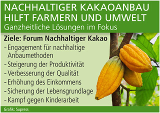 Die Akteure dieser beispielhaften Initiative bündeln ihr Engagement unter enger Zusammenarbeit mit den Anbauländern, um zertifizierte, nachhaltigere Anbaumethoden bei Kakaofarmen zu forcieren. Mit der nachhaltigeren Ausrichtung können Bäuerinnen und Bauern dazu beitragen, die Umwelt zu schützen, die Fruchtbarkeit der Böden sowie den Lebensraum für Tier- und Pflanzenwelt zu er-halten und natürliche Ressourcen zu schonen. Gleichzeitig bewirtschaften die Kleinbauern ihre Farm durch nachhaltigere Praktiken produktiver, erzielen eine bessere Qualität und können deshalb für ihre Rohstoffe höhere Preise verlangen. Langfristig werden Kleinbauern dadurch in die Lage versetzt, ihre Lebensgrundlage ohne missbräuchliche Kinderarbeit zu sichern und ohne Zerstörung wertvoller Ökosysteme.