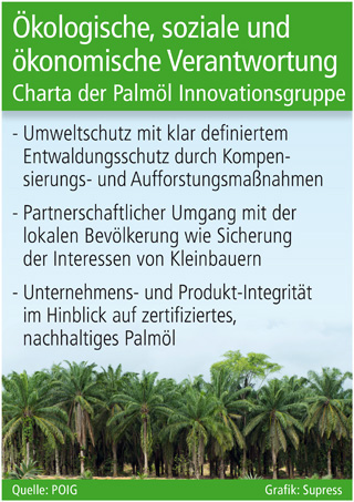 Die Charta der Palmöl Innovationsgruppe fordert eine Forcierung der Ansprüche bezüglich Transparenz und Berichtspflichten im Hinblick auf die ökologische, soziale und ökonomische Verantwortung. Dazu gehören: