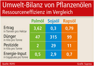 Auch in punkto durchschnittlich benötigtem Einsatz von Dünger sowie Pestiziden für den Anbau sind Ölpalmen vergleichsweise eindeutig ressourcenschonend. Während für die Gewinnung einer Tonne Palmöl ca. 47 kg Dünger und 2 kg Pestizide zum Einsatz kommen, liegen die Vergleichswerte für eine Tonne Sojaöl bei 315 bzw. 29 kg und bei Rapsöl bei 99 bzw. 11 kg. Vorzüge zeigt Palmöl ebenfalls im Hinblick auf den Energie-Aufwand. Der entsprechende Input beträgt pro Tonne bei Palmöl 0,5, bei Sojaöl 2,9 und bei Rapsöl 0,7 Gigajoules.