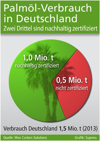 sup.- Deutschland ist vorbildlich im Hinblick auf die Bevorzugung von nachhaltig zertifiziertem Palmöl. Zu diesem Ergebnis kommt eine u. a. von OVID (Verband der ölsaatenverarbeitenden Industrie in Deutschland) in Auftrag gegebenen Untersuchung durch Meo Carbon Solutions. Von den knapp 1,5 Mio. Tonnen Palmöl, die in Deutschland 2013 verwendet wurden, stammen gut zwei Drittel (68 Prozent) von landwirtschaftlich genutzten Flächen, für die soziale, ökologische und ökonomische Mindestanforderungen definiert wurden. Dazu zählen u. a. die Sicherung der Interessen von Kleinbauern sowie der Schutz der tropischen Regenwälder und der Biodiversität durch Kompensierungs- und Aufforstungsmaßnahmen.