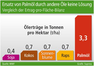 sup.- „Der simple Austausch von Palmöl durch andere Pflanzenöle löst die Probleme nicht, sondern kann sie sogar verschlimmern“, so lautet das Fazit der WWF-Studienleiterin Ilka Petersen. Zu diesem Ergebnis kommt eine Analyse der Beratungsfirma Agripol im Auftrag der Umweltschutzorganisation WWF (World Wide Fund For Nature). Der bereits herrschende Umwandlungsdruck auf natürliche Flächen wie Wälder, Feuchtgebiete oder Savannen würde sich durch den Ersatz von Palmöl verschärfen. Grund hierfür ist die im Vergleich zu anderen Pflanzenölen mit Abstand überlegene Ertrag-pro-Fläche-Bilanz von Ölpalmen. Der Ertrag an Rohöl beträgt bei Palmen pro Hektar rund 3,3 Tonnen, bei nachhaltig bewirtschafteten Plantagen sogar bis zu acht Tonnen. „Der Ertrag von Soja liegt bei nur 0,4 t Öl/ha, der von Kokosnuss und Sonnenblumenkernen bei etwas unter 0,7 t/ha und bei Raps bei leicht über 0,7 t/ha“, bestätigt die WWF-Studie. Für die in Deutschland jährlich genutzten rund 1,8 Mio. Tonnen Palmöl werden knapp 400.000 Hektar Anbaufläche, vorwiegend in den Produktionsländern Malaysia und Indonesien belegt. „Würde man Palmöl durch einen Mix aus Raps-, Sonnenblumen-, Kokos- und Sojaöl ersetzen, so würde Deutschland das 5-fache an Fläche benötigen“, so der WWF. Hinzu kommt: Palmöl verfügt über eine Reihe einzigartiger Charakteristika, so dass es auch unter technischen Aspekten in etlichen Bereichen kaum zu ersetzen ist.