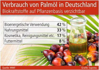 sup.- Ölpalmen sind äußerst effiziente fettliefernde Nutzpflanzen. Dennoch steht Palmöl seit vielen Jahren in der Kritik, weil für die Plantagen Regenwald geopfert wird und Monokulturen die biologische Vielfalt gefährden. Im Auftrag der Umweltschutzorganisation WWF hat die Beratungsfirma Agripol eine aktuelle Analyse zu den Aspekten Substitution, Konsum und Umweltfolgen von Palmöl erstellt. Weltweit spielt der Einsatz von Palmöl in Nahrungsmitteln mit 68 Prozent die größte Rolle, gefolgt von industriellen Verwendungen für z. B. Kosmetika, Wasch- und Reinigungsmittel (27 Prozent) sowie der energetischen Nutzung (fünf Prozent). Ganz anders sieht hingegen die Situation in Deutschland aus. Der größte Anteil des Verbrauchs von Palmöl fließt bei uns in die Bioenergie (42 Prozent), auf die Konsumgütergruppe Nahrungsmittel entfallen hingegen nur 33 Prozent, auf industrielle Verwendungen 17 Prozent sowie auf Futtermittel acht Prozent.