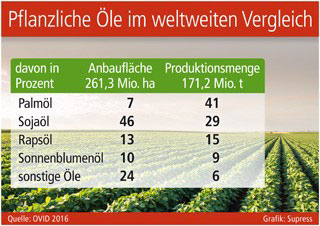 sup.- Handeln Verbraucher ökologisch vorbildlich, wenn sie Produkten mit dem Hinweis „ohne Palmöl“ den Vorzug geben? Ein nüchterner Faktencheck lässt dieses vermeintlich umweltbewusste Konsumverhalten äußerst fragwürdig erscheinen. Laut Zahlen von OVID (Verband der ölsaatenverarbeitenden Industrie in Deutschland) ist Palmöl mit einem Anteil von 41 Prozent an der weltweiten Produktion von fettliefernden Nutzpflanzen das wichtigste Pflanzenöl. Gleichzeitig beansprucht es aber nur sieben Prozent an den globalen Anbauflächen für diese Nutzpflanzen. Die Ertrag-pro-Fläche-Bilanz fällt bei alternativen Pflanzenölen deutlich schlechter aus. Sojaöl kommt z. B. auf einen Weltmarktanteil von 29 Prozent, benötigt dafür aber 46 Prozent der entsprechenden Anbaufläche. Nicht viel besser schneiden Raps- sowie Sonnenblumenöl ab.