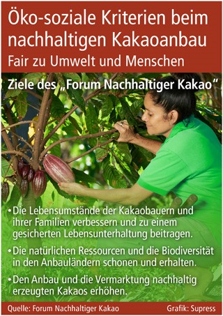 sup.- Wer seine Schokolade mit gutem Gewissen essen möchte, sollte Wert darauf legen, dass der Hersteller Mitglied in der Gemeinschaftsinitiative „Forum Nachhaltiger Kakao“ ist. Dann ist gewährleistet, dass die Unternehmen sich nachweislich dafür engagieren, soweit auf dem Markt erhältlich, bevorzugt nachhaltig erzeugten Kakao für die Produktion ihrer Ware zu verwenden. Die wichtigste Zutat für Schokolade muss dann entsprechend den international anerkannten Nachhaltigkeitsstandards (z. B. von Fairtrade, Rainforest Alliance, UTZ Certified) angebaut und zertifiziert sein. Diese Standards umfassen nicht nur ökologische Aspekte, sondern auch ökonomische und soziale Kriterien, weil sich alle drei Bereiche gegenseitig bedingen und beeinflussen – eine Tatsache, die bei Umweltdiskussionen manchmal zu wenig Berücksichtigung findet.