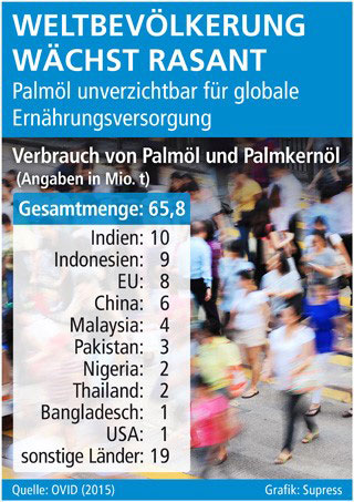 Palmöl gehört in vielen Ländern mit dem höchsten Konsum wie Indien, Indonesien, China und Malaysia zu den wesentlichen Grundnahrungsmitteln. Der Verbrauch von Palmöl beträgt laut Zahlen von OVID (Verband der ölsaatenverarbeitenden Industrie in Deutschland) im Jahr 2015 in der Europäischen Union rund acht Mio. t, davon knapp eine Mio. t in Deutschland.