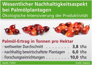 Die beste Ertrag-pro-Fläche-Bilanz unter den relevanten fettliefernden Nutzpflanzen bieten Ölpalmen. Im weltweiten Durchschnitt wird auf Palmölplantagen ein Ölertrag von 3,8 Tonnen pro Hektar (t/ha) erzielt. Der vergleichbare Ertrag beträgt nach Zahlen des Center for International Foresty Research (CIFOR) hingegen z. B. bei Sojabohnen nur 0,37 t/ha, bei Sonnenblumen 0,8 t/ha und bei Raps 1,0 t/ha. Nachhaltig bewirtschaftete Palmölplantagen kommen sogar bereits auf eine Ertragsbilanz von knapp 6 t/ha. Und in Forschungseinrichtungen wurden Spitzenwerte von 10 t/ha erreicht.