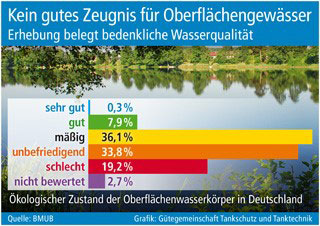 sup.- In Deutschland gibt es rund 9.900 so genannte Oberflächenwasserkörper. Hinter diesem Begriff verbergen sich Flüsse, Flussabschnitte, Seen, aber auch Speicherbecken oder Teile eines Kanals, deren ökologischer Zustand jeweils einzeln erfasst und bewertet wird. Die aktuellen Ergebnisse dieser Qualitätserhebungen sind ernüchternd: Laut Bundesministerium für Umwelt, Naturschutz, Bau und Reaktorsicherheit (BMUB) verdienen lediglich 7,9 Prozent der Oberflächengewässer das Prädikat „gut“, mit „sehr gut“ werden sogar nur 0,3 Prozent benotet. Der große Rest erwies sich bei der Einstufung nach den Vorgaben der „Verordnung zum Schutz der Oberflächengewässer“ (OGewV) als „mäßig“ (36,1 Prozent), „unbefriedigend“ (33,8 Prozent) oder „schlecht“ (19,2 Prozent). Dieses bedenkliche Gesamtbild beschreibt die Beschaffenheit der Wasserkörper nahezu flächendeckend, denn bis auf 2,7 Prozent konnten bereits alle belastbar bewertet werden.