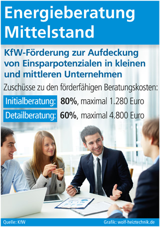Investitionen in eine effizientere Nutzung von Energie können also deutliche Kostensenkungen und dadurch Vorteile am Markt generieren. „Die Verbesserung der Energieeffizienz in Unternehmen ist nicht nur für die Erreichung ambitionierter energie- und klimapolitischer Ziele wichtig, sondern stärkt auch die Wettbewerbsfähigkeit der deutschen Wirtschaft“, so Dr. Axel Nawrath, Vorstandsmitglied der KfW Bankengruppe. Deshalb hat die KfW ihre Fördermaßnahmen für Sanierungen und für Investitionen in zeitgemäße Anlagentechnik um das Programm „Energieberatung Mittel-stand“ ergänzt (www.kfw.de). Denn bevor sich Sparpotenziale erschließen lassen, müssen diese erst einmal identifiziert werden – eine anspruchs-volle Aufgabe für Fachleute. So gewährt das Programm einen Zuschuss von 80 Prozent bzw. maximal 1.280 Euro für eine sogenannte Initialberatung, die die grundsätzlichen Sparpotenziale aufdecken soll. 60 Prozent bzw. maximal 4.800 Euro gibt es für die Detailberatung: eine meist mehr-tätige Erarbeitung konkreter energetischer Verbesserungsvorschläge.