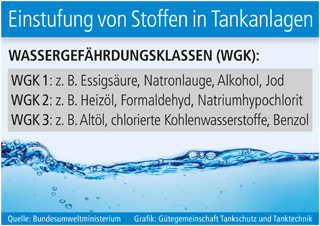 Für die Tankanlagen gelten abgestufte Sicherheitsanforderungen, deren Umfang jeweils von der Zuordnung der Inhalte zu einer der drei so genannten Wassergefährdungsklassen (WGK) abhängig ist. Die WGK 1 umfasst schwach wassergefährdende Substanzen wie z. B. Essigsäure, Natronlauge, Alkohol oder Jod. In der mittleren WGK 2 sind Stoffe wie Heizöl, Formaldehyd und Natriumhypochlorit gelistet. Und die WGK 3 gilt, sobald die Lagerbehälter stark wassergefährdende Inhalte, also beispielsweise Altöl unbekannter Herkunft, Benzin, Benzol oder chlorierte Kohlenwasserstoffe etwa aus Pflanzenschutzmitteln enthalten. Da der Umgang mit diesen Risikostoffen hochspezialisierte Sachkenntnis erfordert, dürfen Arbeiten an den Tanks bei allen drei Gefährdungsklassen nur von anerkannten Fachbetrieben nach Wasserrecht durchgeführt werden. Der Bundesverband Behälterschutz e. V. (Freiburg) warnt davor, diese gesetzliche Vorgabe zu ignorieren: „Umgeht ein Unternehmen mit entsprechenden Tankanlagen etwa bei der Auftragsvergabe für Wartungsarbeiten die grundsätzliche Fachbetriebspflicht, kann es für mögliche Schäden haftbar gemacht werden.“