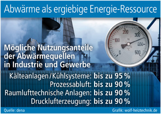 Als einer der weltweit führenden Klimagerätehersteller gehört deshalb z. B. auch der Systemspezialist Wolf Heiz- und Klimatechnik (Mainburg) zu den Projektpartnern der Initiative „Abwärmenutzung in Industrie und Gewerbe“. Kälteanlagen und Kühlsysteme zählen nämlich nach Angaben der dena zu den ergiebigsten Abwärmequellen aus Gebäudetechnik und industriellen Verfahren: Bis zu 95 Prozent der Abwärme können hier zur Heiz- und Prozesswärmeerzeugung genutzt werden (www.wolf-heiztechnik.de). Nahezu ebenso effektiv ist der Einsatz raumlufttechnischer Anlagen bzw. der Prozessabluft und der elektrischen Antriebsleistung von Druckluftkompressoren als Abwärmequelle. Solche Ergebnisse lassen sich jedoch nur erzielen, wenn am Anfang eines betrieblichen Nutzungskonzeptes für Abwärme eine umfassende, kompetente Beratung steht. Dies erleichtern jetzt die erweiterten Förderkonditionen, die auch eine fachkundige Begleitung bei der Umsetzung der vorgeschlagenen Maßnahmen umfassen.