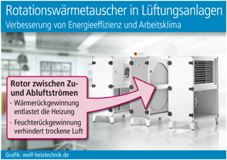 sup.- Bei zeitgemäßen Lüftungsanlagen ist die Effizienz der Wärme- und Feuchterückgewinnung ein wesentliches Qualitätskriterium. Gerade in Gewerbebetrieben und Bürogebäuden, in denen der kontrollierte Luftaustausch Voraussetzung für ein angenehmes Arbeitsklima ist, sorgen diese Funktionen für deutlich geringeren Energiebedarf. Zum einen können die Wärmepotenziale aus der verbrauchten Luft bei Bedarf auf die zugeführte Frischluft übertragen werden und damit die Heizung entlasten. Zum anderen lässt sich auch ein großer Teil der Feuchtigkeit aus der Abluft zurückgewinnen. Gerade in der kalten Jahreszeit wird auf diese Weise an den Arbeitsplätzen die gefürchtete allzu trockene Luft vermieden, die zu Unbehaglichkeit, Konzentrationsschwierigkeiten und einer erhöhten Anfälligkeit für Atemwegserkrankungen führt. Ein technisches Konzept, das beide Aufgaben optimal meistert, sind Lüftungssysteme mit so genannten Rotationswärmetauschern. In diesen Anlagen werden Wärme und Feuchte mit Hilfe einer rotierenden Speichermasse zwischen den Luftströmen übertragen. Die hohe Ergiebigkeit und der Bedienkomfort der Geräte machen sie zunehmend überall dort zur ersten Wahl für Lüftungs- und Klimalösungen, wo es nicht nur um Luftaustausch, sondern auch um konstant komfortable und gesundheitsfördernde Bedingungen in Innenräumen geht.